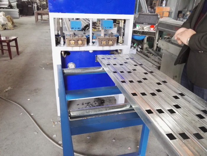 數(shù)控護(hù)欄沖孔機(jī),兩工位同時(shí)工作,一次沖四支管,每個(gè)油缸可單獨(dú)控制沖全孔、半孔,大大提高護(hù)欄沖孔效率