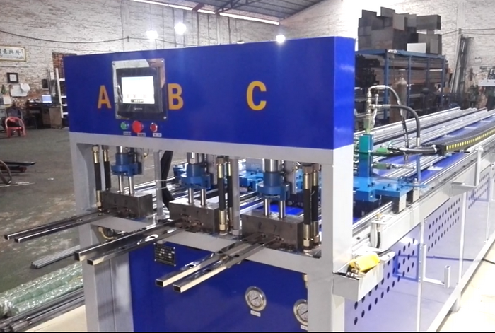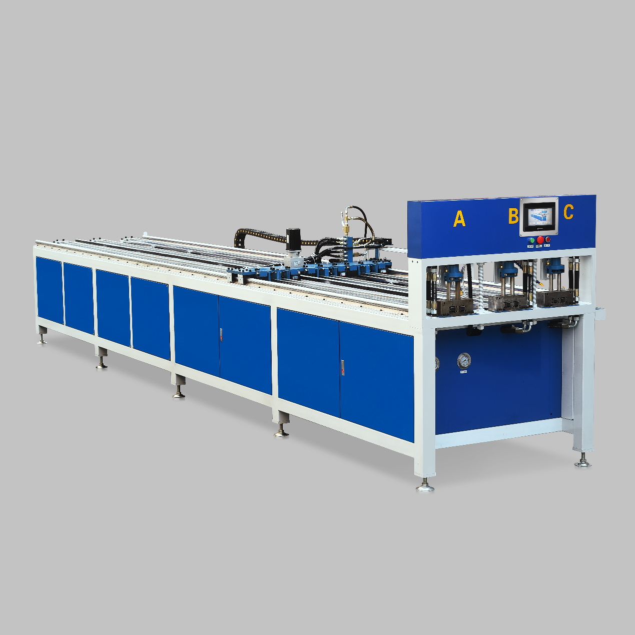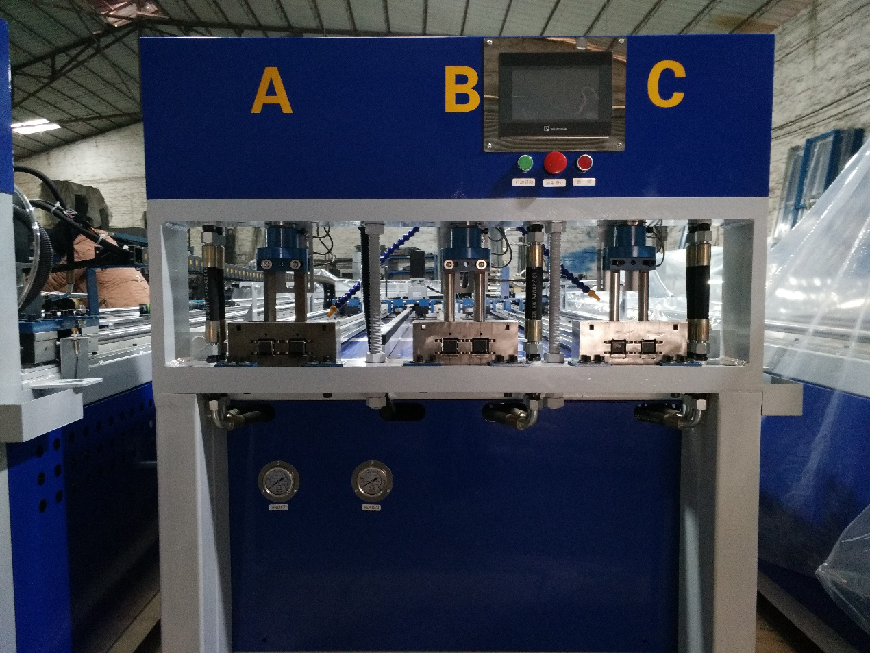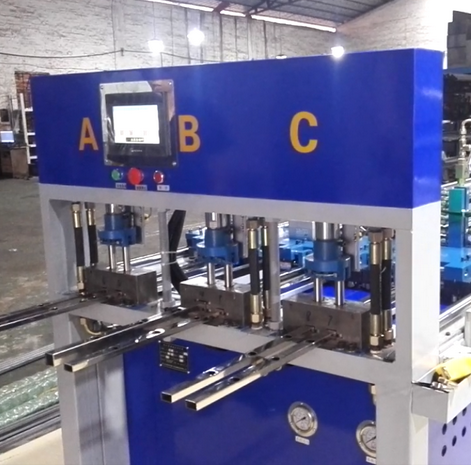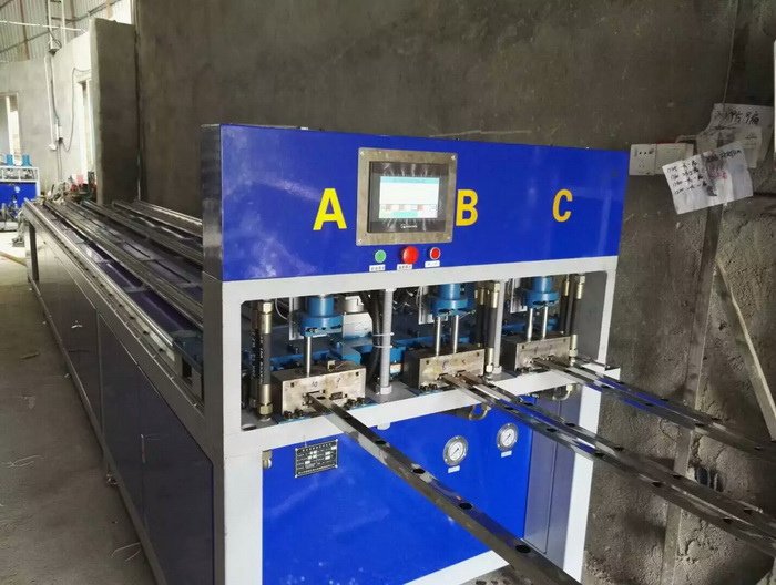 三工位數(shù)控全自動(dòng)沖孔機(jī),三工位同時(shí)工作,一次沖6支管,每個(gè)油缸可單獨(dú)控制沖全孔、半孔,大大提高不銹鋼防盜網(wǎng)沖孔效率,行業(yè)首創(chuàng),專利產(chǎn)品