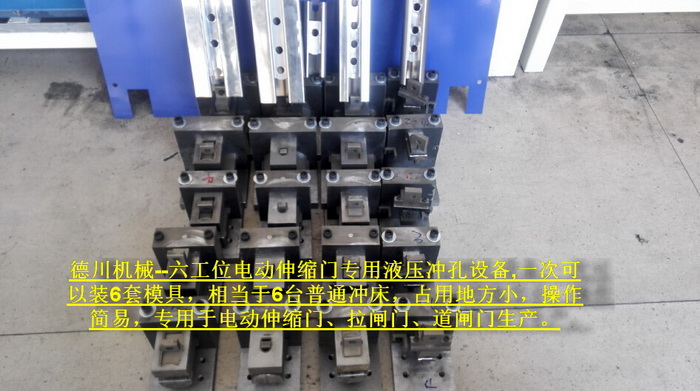 六工位電動伸縮門專用液壓沖孔設備,一次可以裝6套模具,相當于6臺普通沖床,占用地方小,操作簡易,專用于電動伸縮門、拉閘門、道閘門生產。...