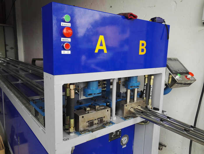 數(shù)控全自動(dòng)樓梯沖孔機(jī),兩工位同時(shí)工作,一次沖四支管,每個(gè)油缸可單獨(dú)控制沖全孔、半孔,大大提高樓梯圓管沖孔效率。