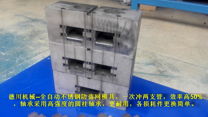 全自動不銹鋼防盜網(wǎng)模具,一次沖兩支管,效率高50%,軸承采用高強(qiáng)度的圓柱軸承,更耐用,各損耗件更換簡單。