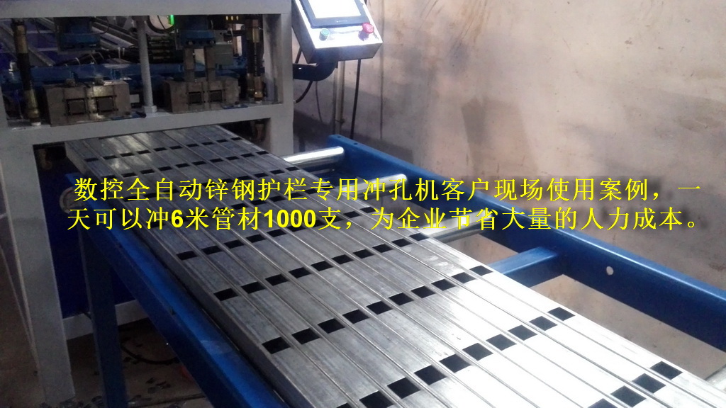 我司在管材沖孔設(shè)備多年的技術(shù)積累、良好的品牌效應(yīng)的基礎(chǔ)上研發(fā)出新一代兩工位數(shù)控全自動液壓沖孔機(jī),比市場上同類型產(chǎn)品效率高50%,提高管材加工企業(yè)的效率,增加企業(yè)的競爭力;主要具有如下特點(diǎn):一次可以同時(shí)沖4支管,最高速度可以達(dá)到每秒鐘沖3個孔,一天可以沖6米管材1000支、防盜網(wǎng)1000平方;一支管上可沖雙面孔、單面孔,兩工位可以同時(shí)控制,也可以分開獨(dú)立控制;采用人性化人機(jī)交互操作界面,不需要專業(yè)人員編程,可任意控制沖等距或不等距孔;各種型號沖孔參數(shù)可保存在系統(tǒng)內(nèi),用時(shí)只需要調(diào)出參數(shù)即可;可根據(jù)客戶使用要求增加自動切料系統(tǒng),可以同時(shí)進(jìn)行自動沖孔、切料工作;系統(tǒng)完全自主研發(fā),可根據(jù)客戶的要求增加不同的功能;裝模、換模簡單,機(jī)臺上有定位裝置,模具對準(zhǔn)定位裝置后鎖緊螺絲即可;廣泛應(yīng)用于不銹鋼、防盜網(wǎng)、護(hù)欄、貨架、金屬家具、汽車配件、建筑材料生產(chǎn)企業(yè)等五金管件、型材沖孔、開料加工。